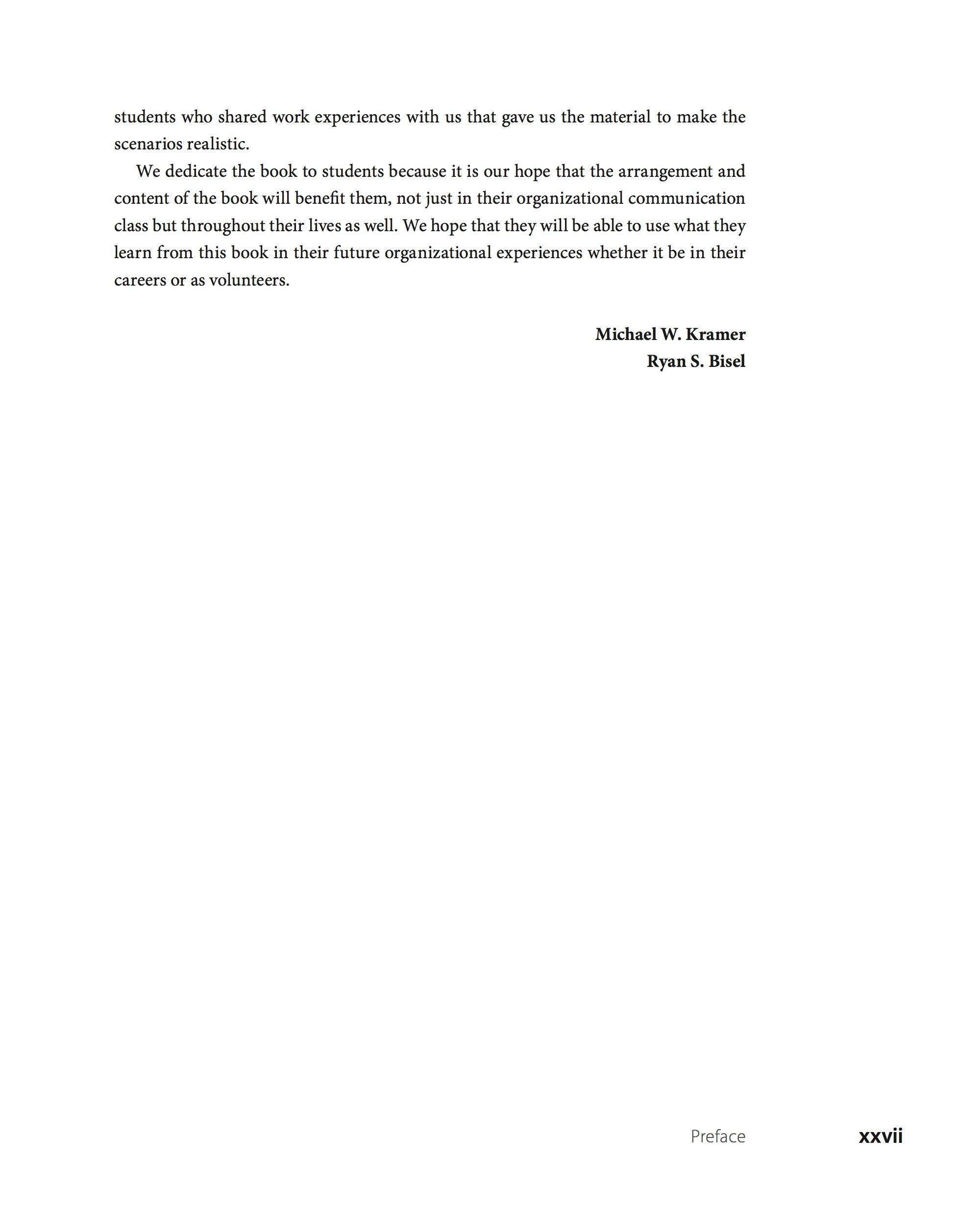 We dedicate the book to students because it is our hope that the arrangement and content of the book will benefit them, not just in their organizational communication class but throughout their lives as well. We hope that they will be able to use what they learn from this book in their future organizational experiences whether it be in their careers or as volunteers.