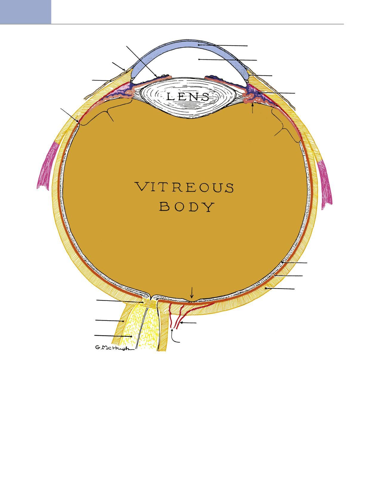 Chapters are roughly arranged anatomically, starting anteriorly and moving posteriorly Chapter 2 details eyelid structure and histology, including the roles that the muscles and glands have in tear lm secretion and drainage. Chapters 3 through 8 include the anatomy, detailed histology, and physiology of the structures constituting the globe Each of the three coats of the eye the cornea and sclera, uvea, and retina is covered in separate chapters. Included in each is an emphasis on similarities and dierences between regions within each coat and notations about layers that are continuous between structures and regions. Chapters 6 covers the chambers inside the globe and the production and composition of the material that occupies those spaces, and Chapter 7 describes the crystalline lens.