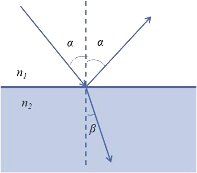 Refractionattheinterfaceoftwomedia.Theprimaryrayispartiallyreflectedandpartiallyrefracted. a and b aretheanglesofincidenceandrefractionwithrespecttothesurfacenormal,respectively.