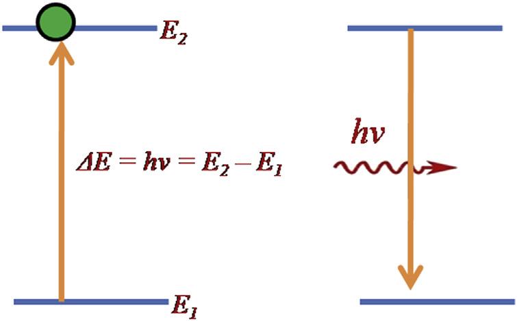 Asmentionedabove,awayinwhichmattercaninteractwithlightisthroughabsorption.Absorptionisthe processinwhichenergytransferfromaphotonofEMradiationtotheanalyte’satomsormoleculestakes place.Thegeneralprocesseswhichoccurduringlightabsorptionandemissionareshownin(Fig.1.2). Chemicalspeciesthatisatlowenergystatemovetoahigherenergystatebyabsorptionoflight.