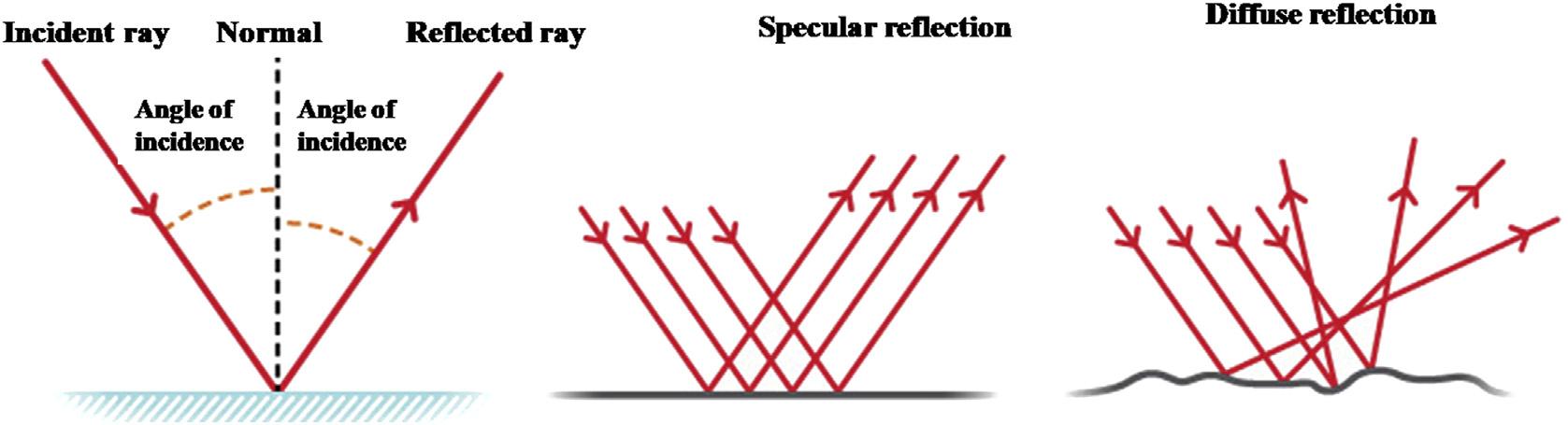 Schematicdiagramforreflectionfromasmoothmirrorsurface(left)andirregularsurface(right). 1.3
