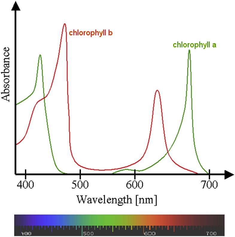 Thestrongestabsorptionoflightforchlorophyll‘a’occursatabout450nmand660nm.The strongestabsorptionoflightforchlorophyll‘b’takesplaceatroughly460nmand635nm.Wavelengthsbetween500and600nmhavethegreatestdegreeoftransmittancebybothchlorophylls‘a’and ‘b’.Smalldifferencesinthesewavelengthrangesarepresentforthesetwotypesofchlorophyll becauseoftheirdifferentchemicalstructures,whichcreateslightdifferencesintheirenergylevelsand inthetypesoflighttheycanabsorb.