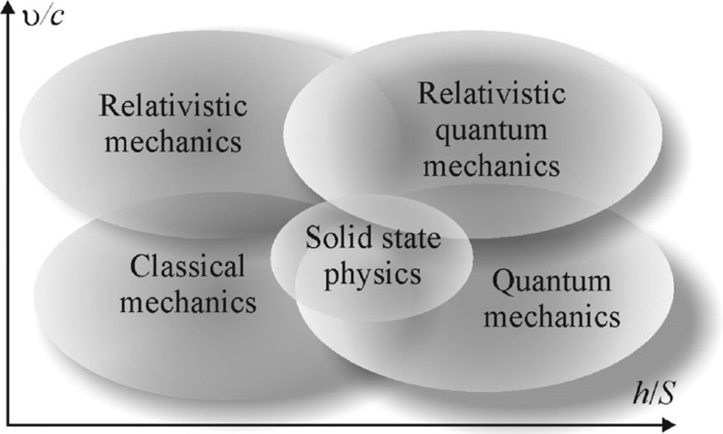 Technicaluniversitycourseofelectronicmaterialsscience,alsoknownas condensed matterphysics or solid-statephysics,usuallyisstudiedinthefinalpartofaseriesof physicscoursessothatitcanbeknowledgegainedbystudentsinpreviouscoursesof physics.Themappingbetweensolid-statephysics,classicalmechanics,quantum mechanics,andrelativisticmechanicsisillustratedin Fig.I.7.Solids-statephysics islocatedbetweenclassicalandquantummechanics.