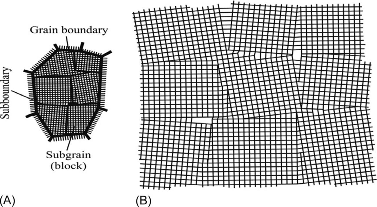 Schemeofcrystallites(grains)withitsborders(A)andblock(mosaic)structureinsidethe crystallites(B).