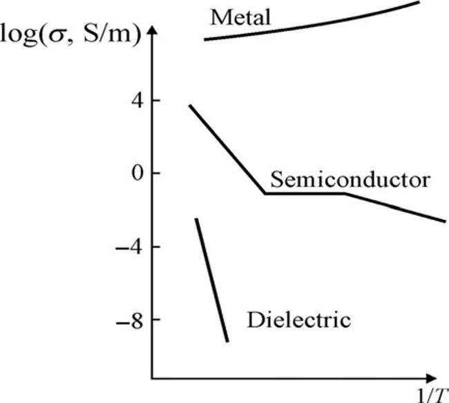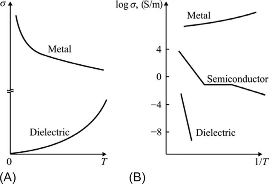 Temperaturedependenceofconductivityinsolids:(A)normalscale,(B)logarithmicscalefor σ andinversedtemperature.