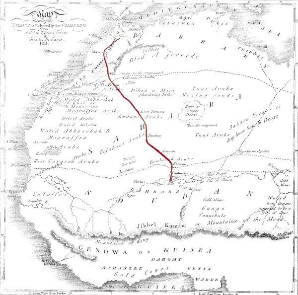 Map shewingtheTRACT as followed by the CARAVANS fromFAS toTIMBUCTOO by Jas. G. Jackson, 1811.