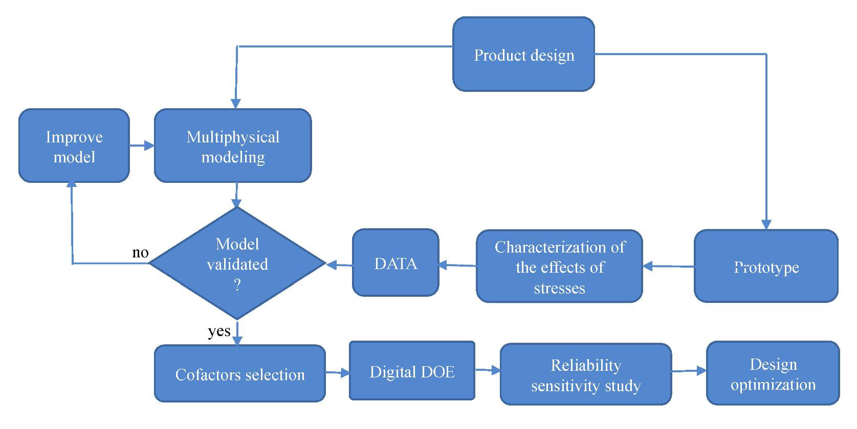 response of the model and measurements obtained on a prototype tested under mechanical or thermomechanical loads. An optimization method can be used to adjust design parameters and reduce the model and prototype response discrepancies and validate the model. Validation of the failure mechanism model is done by comparing the failure predictions to the failures found in tests. The design factors having a strong effect on the system failure mechanism are then identified with a screening method. A plan of numerical experiments makes it possible to develop a metamodel. This metamodel makes it possible to improve design by minimizing the effects of variability in design factors while maximizing reliability. The flow chart of this approach is shown in Figure 1.1.
