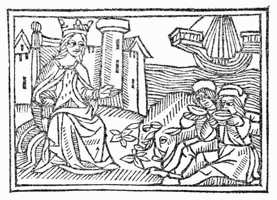 Circés fut une royne qui avoit son royaulme sur la mer d’ytalie & fut moult grant enchanteresse & trop sceut de sors & de annoncemens/ & quant ulixés qui par mer alloit apres la destruction de troye sicomme il cuydoit retourner en son pays par maintz grans tormentz & perilleux qu’il avoit euz fut arivé au port de celle terre/ il manda a la royne par ses chevaliers se il pourroit seurement prendre port sur sa terre. Circés moult beau accueillyt les messagiers & par semblant de courtoisie leur fist tendre bruvaige moult delicieux a boire mais telle vertu avoit par poison que soubdainement furent les chevaliers muez en porcz.