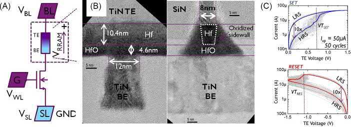 The RRAM category is the name of a group of memory technologies characterized by an electrically reversible resistive switching functionality between a low resistance state (LRS) and a high resistance state (HRS). One of the most attractive advantages of RRAM is the low-cost integration allowed by the combination of CMOS-friendly materials within a simple two-terminal device structure, which typically consists of a dielectric layer sandwiched between two metal electrodes.