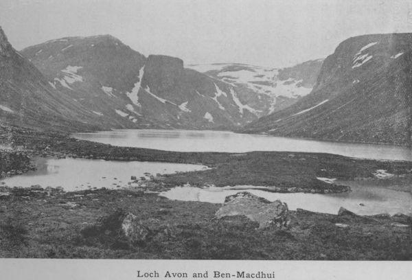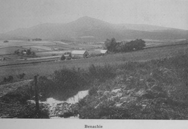 The highest mountain in the Braemar district is Ben-Macdhui (4296 feet). A few others are over 4000—Brae-riach and Cairntoul. Ben-naBuird and Ben-Avon, which last is notable for the numerous tors or warty knots along its sky-line, are just under 4000 feet. Loch-na-gar, a few miles to the east and a conspicuous background to Balmoral Castle, is 3789. Byron called it “the most sublime and picturesque of the Caledonian Alps,” and Queen Victoria writing from Balmoral in 1850 described it as “the jewel of all the mountains here.” Its contour lines, which are somewhat more sharply curved than is usual in the Deeside hills, and the well-balanced distribution of its great mass make it easily recognised from a wide distance. This partly explains the pre-eminence which notwithstanding its inferiority of height it undoubtedly possesses. Due north from Ballater are Morven (2880) and Culblean, and due south is Mount Keen; a little east and on the boundary line of three counties is Mount Battock. Perhaps the most prominent hill, and the one most frequently visible to the great majority of Aberdeenshire folks, is Benachie, which stands as a fitting outpost of the vast regiment of hills. It stands apart and although only 1440 feet in height is an unfailing landmark from all parts of Buchan, from Aberdeen, from Donside, and even from Deveronside. Its well-defined outline and projecting “mither tap” render it an object of interest from far and near, while the presence or absence of cloud on its head and shoulders serves as a barometric index to the state of the weather.