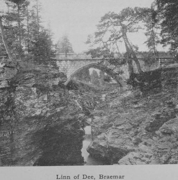 and ragged, gnarled Scots firs to the Linn of Dee, 6-3/4 miles above Braemar. There is no great fall at the Linn, but here the channel of the river becomes suddenly contracted by great masses of rock and the water rushes through a narrow gorge only four feet wide. The pool below is deep and black and much overhung with rocks. For 300 yards stretches this natural sluice, formed by rocks with rugged sides and jagged bottom, the water racing past in small cascades.