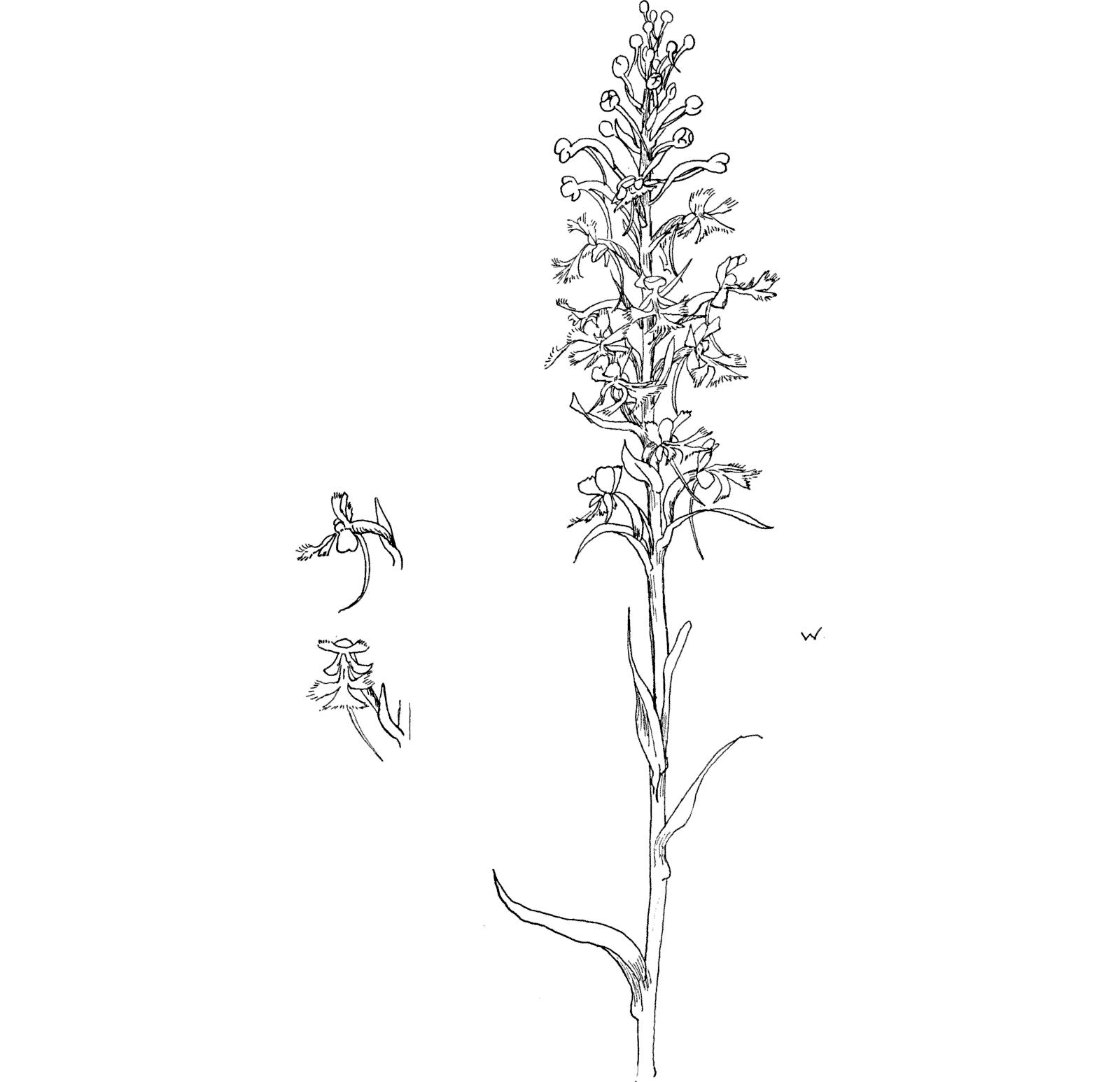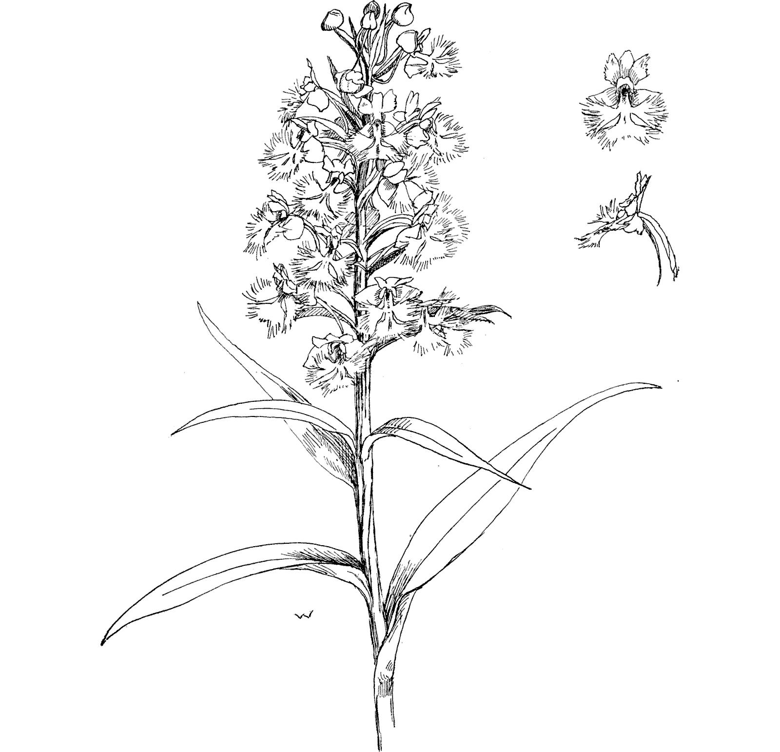 Green at first, the lilac flush overspreads the buds as they swell before the blossoms expand. It is an odorous flower, and fortunately not uncommon. The spur is more curving than that of the Large Purple Fringed, and the whole plant is more slender and less perfect in its details, yet it is sufficiently like its early sister to be taken for a belated specimen of the fimbriatawhen first espied amongst the tall grasses.