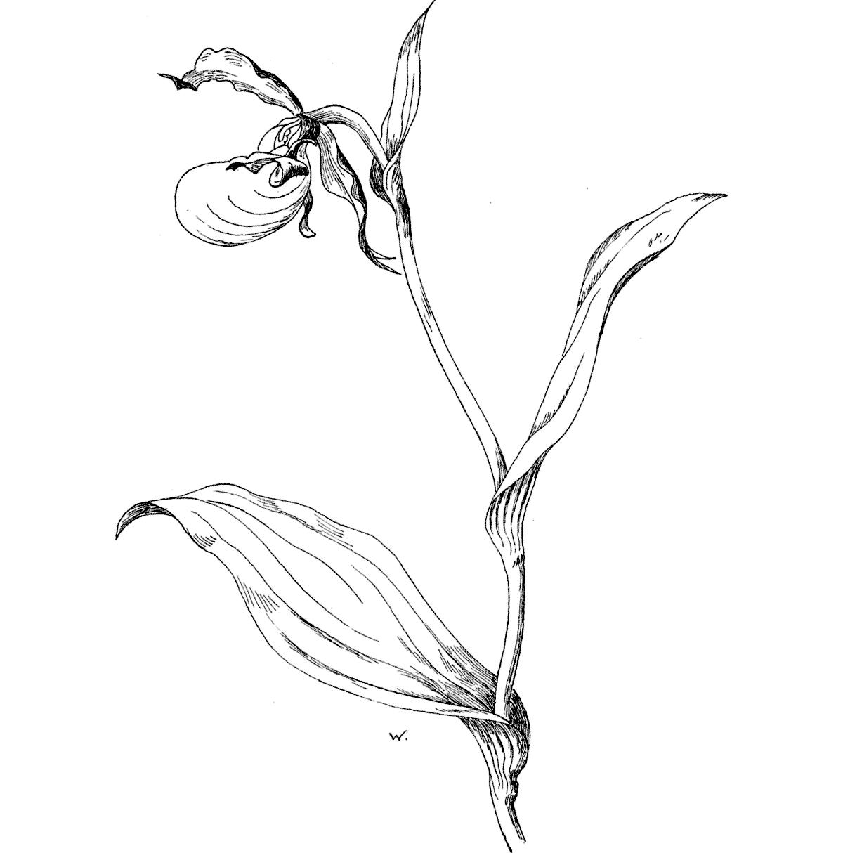 The Yellow Lady’s Slipper’s rounded pouch, or bag, has a circular opening at the top, and is thick in texture, with a smooth and shining surface. The long and narrow side petals are much twisted, and curled; the two calyx-parts are broad-oval, the lower 2-cleft; they are ribbed, with slightly wavy margins. All these parts are thin and downy, and colored dull red, or brownish, or purplish, streaked with green; the pouch is bright yellow, streaked with dull red parallel veins. The flower is set, with an outward swinging gesture, on the tip of the stalk, which is enlarged just beneath the point of contact.