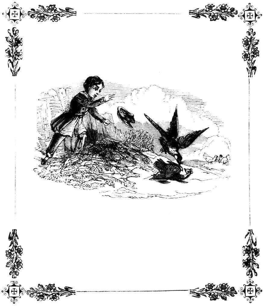 “Oh, aunt!” says Charles, “as soon as I came from school, I went to the farmyard to feed my fowls; and it was very well I did, for what should I see but a cruel hawk pounce down in the midst of my poor chicks: the old hen flew at him, and pecked him well with her beak, and shook her wings at him, but he was too bold to care for that; so I gave a loud shout, and flung my cap at him, just as he flew off with the white chick in his claws. I aimed so well, that the cap struck him, and made him drop his prey: I then ran to it, but the poor thing was quite dead, and its nice white down was all dyed with blood. Do you know, dear aunt, I felt so vexed that the tears came into my eyes; but then I thought I must not be angry with the hawk, for God made it, and had taught it what sort of food to take home to its young ones.”