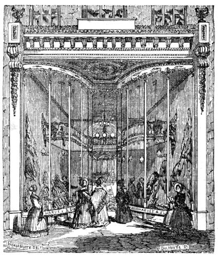 plates of glass eight or ten feet in length, and of proportional width; the sashes are of polished brass. The doors are of the richest mahogany, and the entrance is altogether in the most sumptuous style.