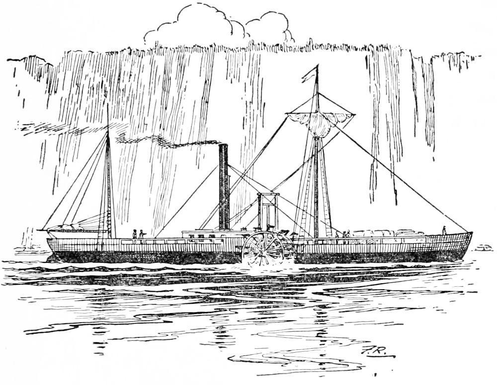 That great American, Benjamin Franklin, whose genius touched such a diversity of subjects, saw, as early as 1775, that paddlewheels were inefficient machines, and called attention to the fact, suggesting that an engine be devised to draw a column of water in at the bow, to project it forcibly astern in order to give the ship headway. This method was tried but before much success had been attained, all engines being of such low power, the screw propeller had been perfected and the water-jet system was dropped, although in 1782 James Rumsey built a boat of this type on the Potomac. In France a steamboat built by the Marquis de Jouffroy is said to have been operated in 1783. This boat was 150 feet long and ran with some degree of success for about a year and a half. Jouffroy has sometimes been given credit for the invention of the steamboat. In 1788 a small vessel of strange design was driven at four or five miles an hour by William Symington in Scotland. This boat was built at the expense of a Scotch banker named Patrick Miller. Two years before this John Fitch, a New Englander, built a fairly successful steamboat that was propelled by steam-driven oars. Symington’s experiments were continued and another boat that made seven miles an hour was running in 1789. Still more successful was another of Symington’s boats, the CharlotteDundas, when, in 1802, she towed two loaded vessels, totalling nearly one hundred and fifty tons at three and one-half miles an hour for a score of miles in the Forth and Clyde Canal. The project was abandoned, however, because of the effect of the agitated water on the banks of the canal. The Dundas was, of course, driven by a paddle-wheel. Symington continued his efforts but was unfortunately handicapped financially, and when Lord Bridgewater, his next backer, died, he withdrew from the field, reduced to poverty.