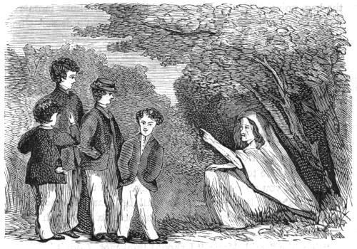 Max looked, and while he did so, the moon, breaking through a cloud, lighted up the carriage drive in front of the house; while its rays, falling upon an arbutus tree, distinctly revealed a dark figure crouched beside it. It seemed to be a very old woman, sitting, Irish fashion, with her chin resting on her knees, while she rocked herself to and fro, and crooned out a wailing Irish keen. Her face (which was very dark coloured) was turned towards the boys, and her large features and long grey hair gave her a very uncanny appearance. Seeing Dennis, she beckoned to him. “Come with me, Max,” said he; “I’m awfully frightened.” “I’ll go, too,” said Harry. “And I.” “And I.” So they all stepped through the open window, and were soon standing round the old crone.
