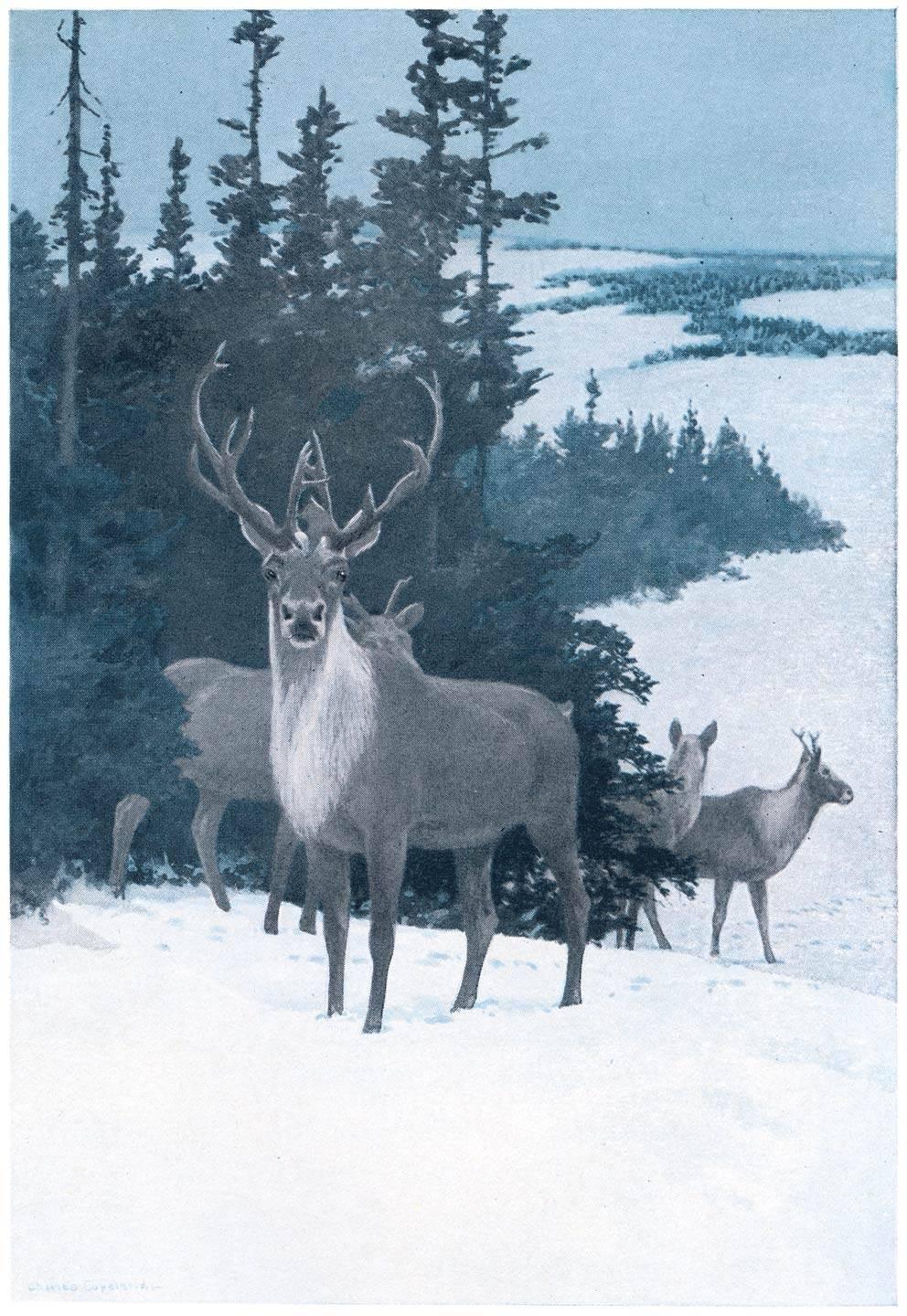 I was trailing a herd of caribou one winter day on the barrens (treeless plains or bogs) of the Renous River in New Brunswick. For hours I had followed through alternate thick timber and open bog without alarming or even seeing my game. The animals were plainly on the move, perhaps changing their