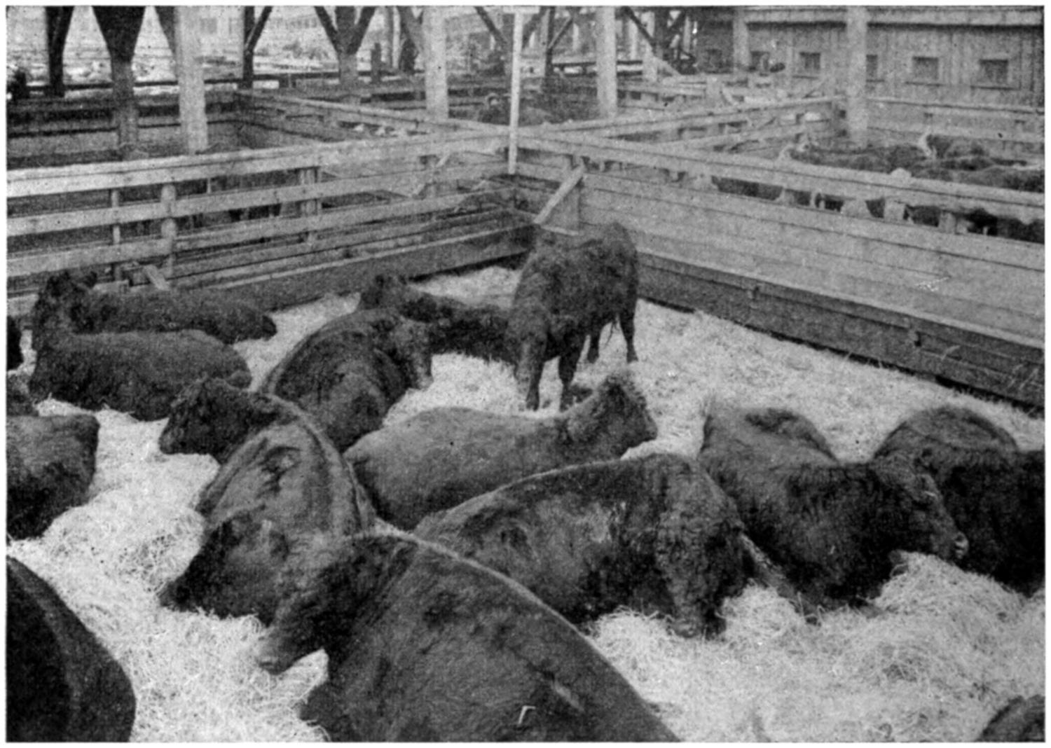 Chicago Yards.—One of the first and largest of these central live stock depots to be established was the Union Stock Yards, Chicago, Ill., U. S. A., where are located the largest slaughter houses. Views of these great yards are shown. Fig. 1 shows one of the places where live stock is passed to the scales and weighed prior to delivery to the purchaser; Fig. 2, a view of the live stock pens and an alleyway on a busy day; Fig. 3, a view of a pen containing choice yearling cattle, and Fig. 4, one containing a bunch of choice PolledAngus cattle. These views are typical of many markets now established throughout the United States and where the business is conducted upon a parallel basis.