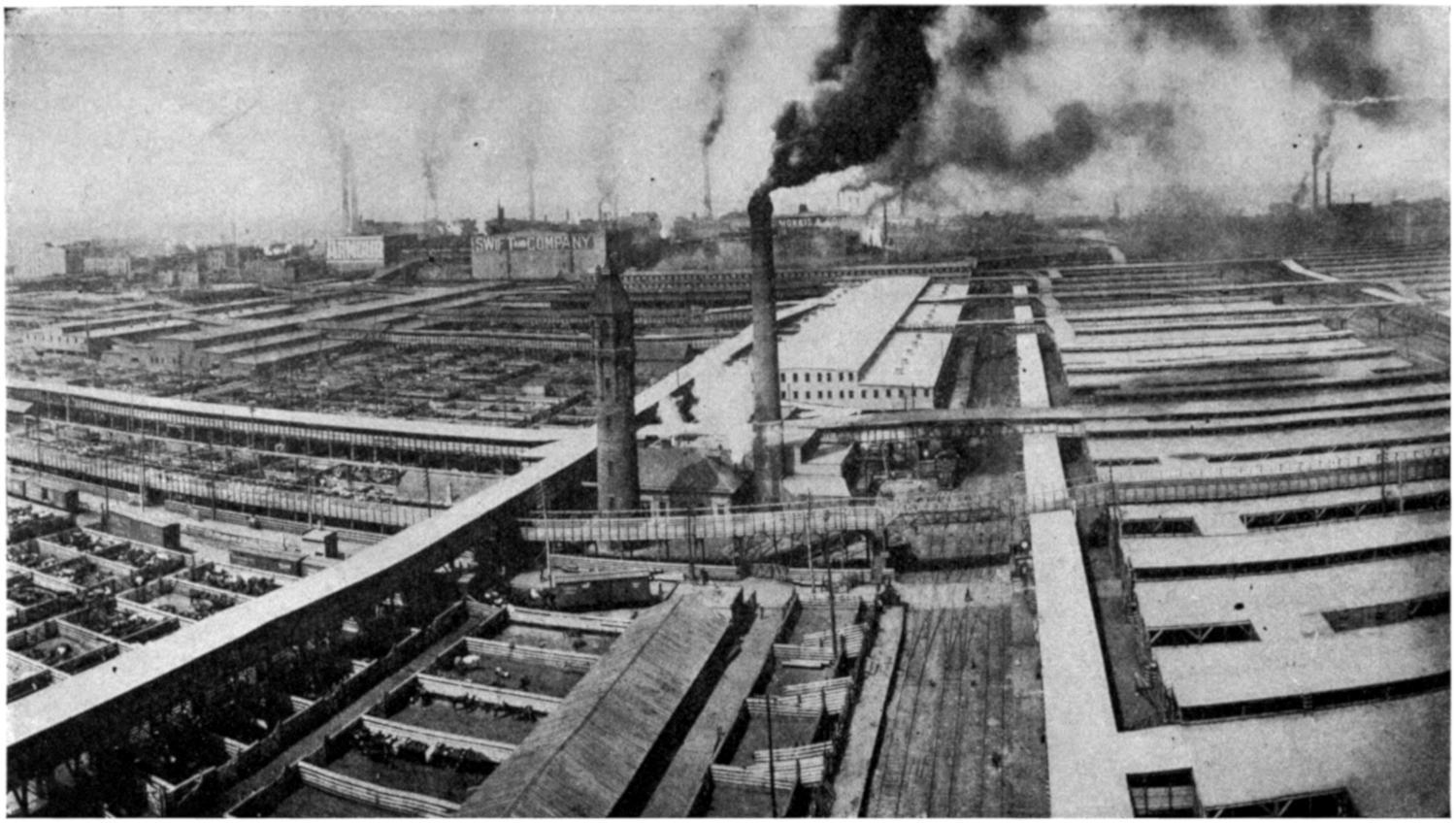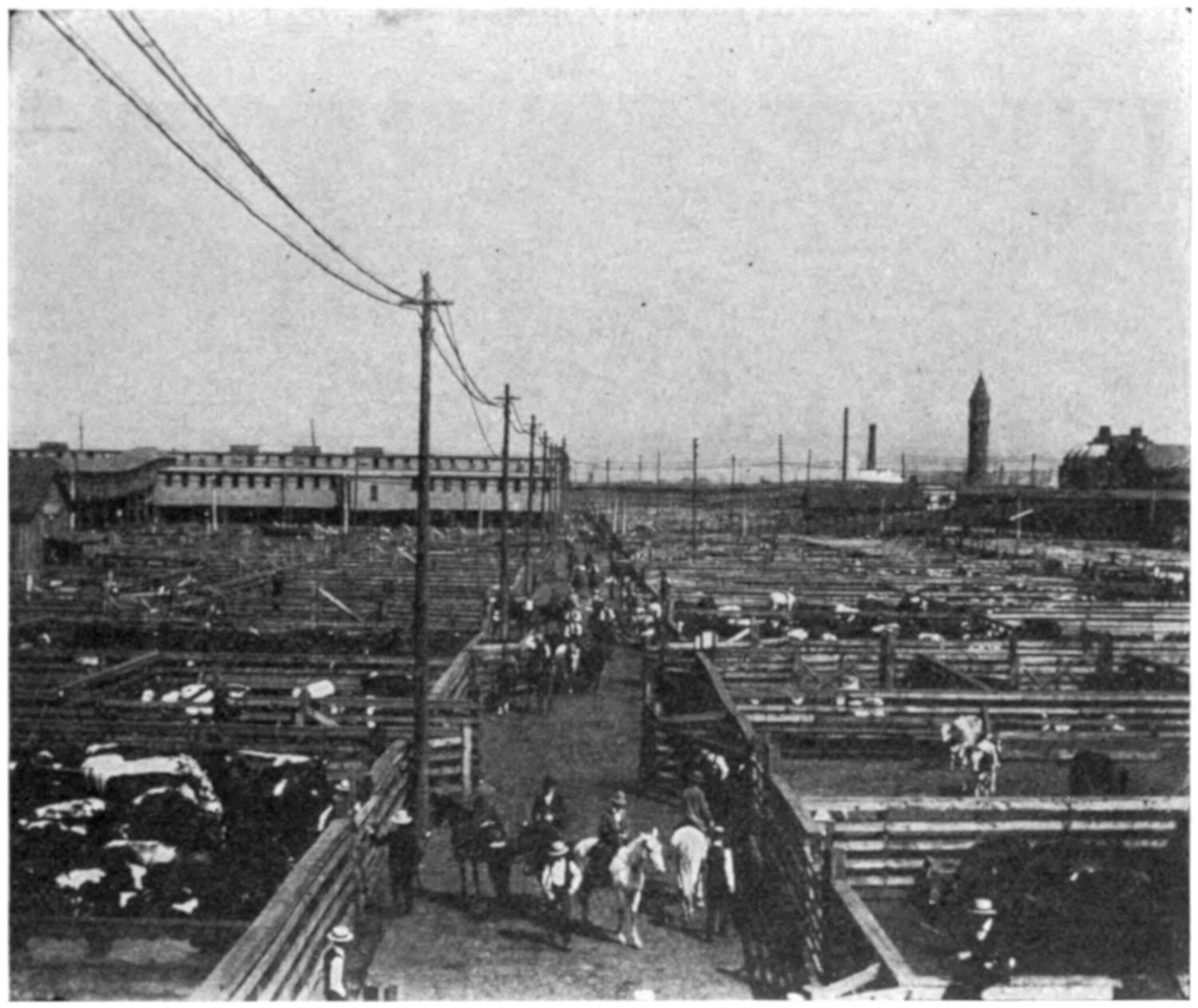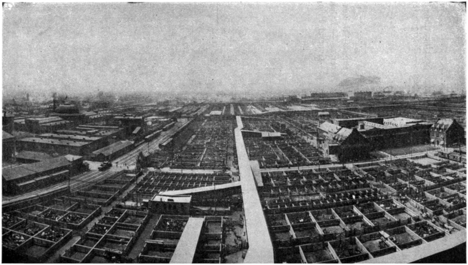 GENERAL VIEW OF UNION STOCK YARDS, CHICAGO, SHOWING PACKING HOUSES IN THE DISTANCE.