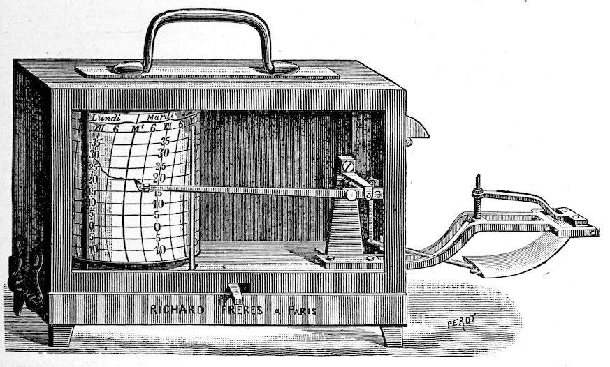 98. Thermographs. Two types of standard instruments are in general use for obtaining continuous records of air temperatures. These are the Draper thermograph, made by the Draper Manufacturing Company, 152 Front St., New York city ($25 and $30), and the Richard thermograph sold by Julien P. Friez, Baltimore ($50). After careful trial had demonstrated that they were equally accurate, the matter of cost was considered decisive, and the Draper thermograph has been used exclusively in the writer’s own work. This instrument closely resembles the psychrograph manufactured by the same company. It is made in two sizes, of which the larger one is the more satisfactory on account of the greater distance between the lines of the recording disk. The
