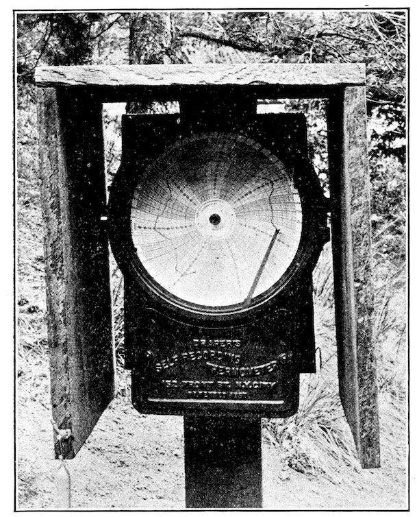 thermometric part consists of two bimetallic strips, the contraction and expansion of which are communicated to a hand carrying a pen. The latter traces a line on the record sheet which is attached to a metal disk made to revolve by an eight-day clock. In practice the thermograph is set up in the shelter which contains the psychrograph, and in exactly the same manner. The clock is wound, the record put in place, and the pen inked in the same way also. The proper position of the pen is determined by making a careful thermometer reading under the shelter, and then regulating the pen hand by means of the screws at the base of it A similar test reading is also made each week, when the clock is rewound. A record sheet may be left in position for three weeks, the pen being filled each week with a different ink. The fixed order of using the inks is red, blue, and green as already indicated.
