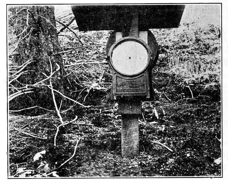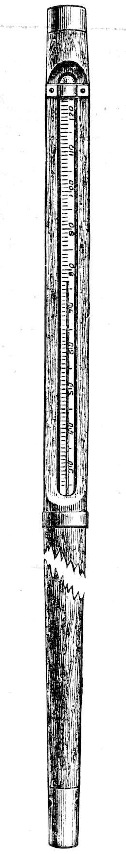 Regular soil thermometers are indispensable when readings are desired at depths greater than 12–18 inches. They possess several disadvantages which restrict their use almost wholly to permanent stations. It is scarcely possible to carry them on field trips, and the time required to place them in the soil renders them practically useless for single readings. Moreover, the instruments are expensive, ranging in price from $7 for the two-foot thermometer, to $19 for the eight-foot one. When it is recognized that deep-seated temperatures are extremely constant and that the slight fluctuations affect, as a rule, only the relatively stable shrubs and trees, it is evident that such temperatures are of restricted importance. Still, in any habitat, they must be ascertained before they can well be ignored, though it is unwise to spend much time and energy in their determination. Soil thermometers of the form illustrated may be obtained from H. J. Green, Brooklyn.