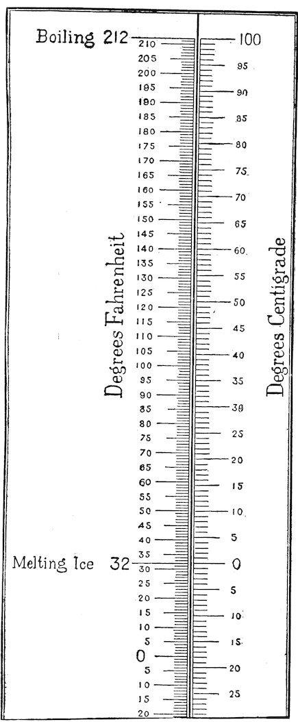 On page 47 is given a table for the conversion of Centigrade into Fahrenheit temperatures. This may be donementallybymeansoftheformula F = C/5×9+32°.