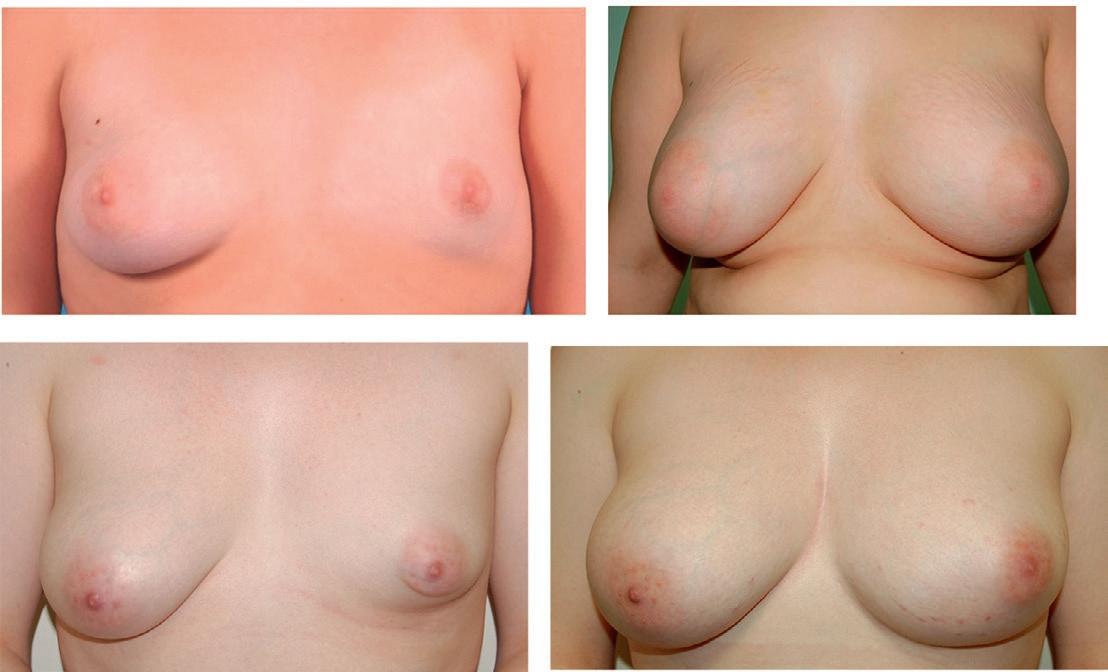 • Macromastia is defined as breast weight exceeding 2–3% of total body weight. It can be progressive, is more often bilateral than unilateral, and is thought to be due to rapidly developing connective tissue resulting from excess levels of growth factors or hormones. It typically presents at puberty or postpartum. Reduction mammaplasty after adolescence is the treatment of choice.12