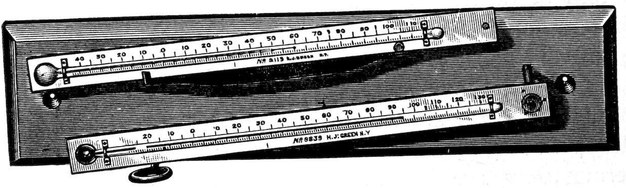 94. Air thermometers. The accurate measurement of temperature requires standard thermometers. Reasonably accurate instruments may be standardized by determining their error, but they are extremely unsatisfactory in practice, since they result in a serious waste of time. Accurate thermometers which read to the degree are entirely serviceable as a rule, but instruments which read to a fraction of a degree are often very much to be desired. The writer has found the “cylindrical bulb thermometer, Centigrade scale” of H. J. Green, to be an exceedingly satisfactory instrument. The best numbers for general use are 247 and 251, which read from –15° to 50° C. and are graduated in .2°. They are respectively 9 and 12 inches long, and cost $2.75 and $3.50. These instruments are delicate and require careful handling, but even in class work this has proved to be an advantage rather than otherwise. In making readings of air temperatures with such thermometers, constant precautions must betakentoexposethebulbdirectlytothewindand to keepitawayfromthehandandperson.