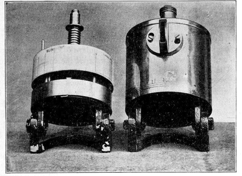 80. The Dawson-Lander sun recorder. “The instrument consists of a small outer cylinder of copper which revolves with the sun, and through the side of which is cut a narrow slit to allow the sunshine to impinge on a strip of sensitive paper, wound round a drum which fits closely inside the outer cylinder, but is held by a pin so that it can not rotate. By means of a screw fixed to the lid of the outer cylinder, the drum holding the sensitive paper is made to travel endwise down the outer tube, one-eighth of an inch daily, so that a fresh portion of the sensitive surface is brought into position to receive the record.” The instrument is driven by an eight-day clock placed in the base below the drum. The slit is covered by means of a flattened funnel-shaped hood, and the photographic strip is protected from rain by a perfectly transparent sheet of celluloid. The detailed structure of the instrument is shown in figure 12.Thisinstrumentmaybeobtainedfrom LanderandSmith,Canterbury,England,for$35.