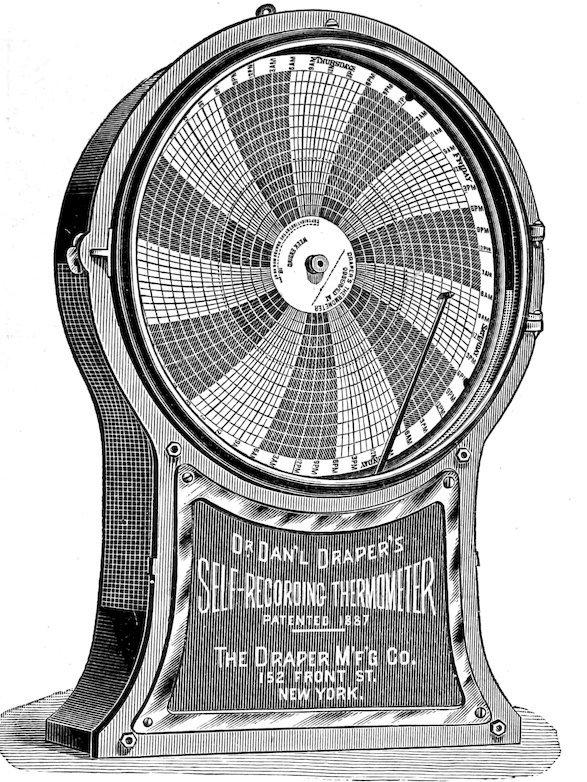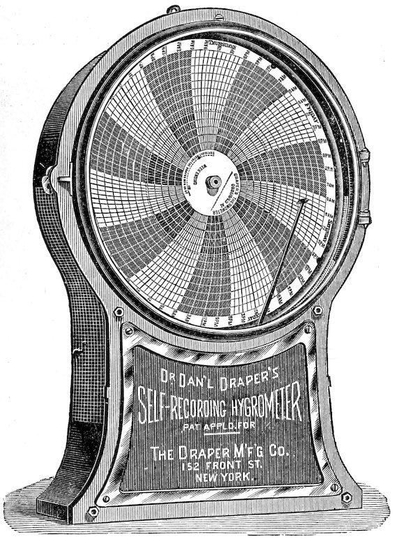 The Draper psychrograph is made by the Draper Manufacturing Company, 152 Front St., New York city. The price is $30. A few record sheets and a bottle of red ink are furnished with it. Additional recordscanbeobtainedat3centseach.Theinksare25–50centsperbottle,dependinguponthecolor.