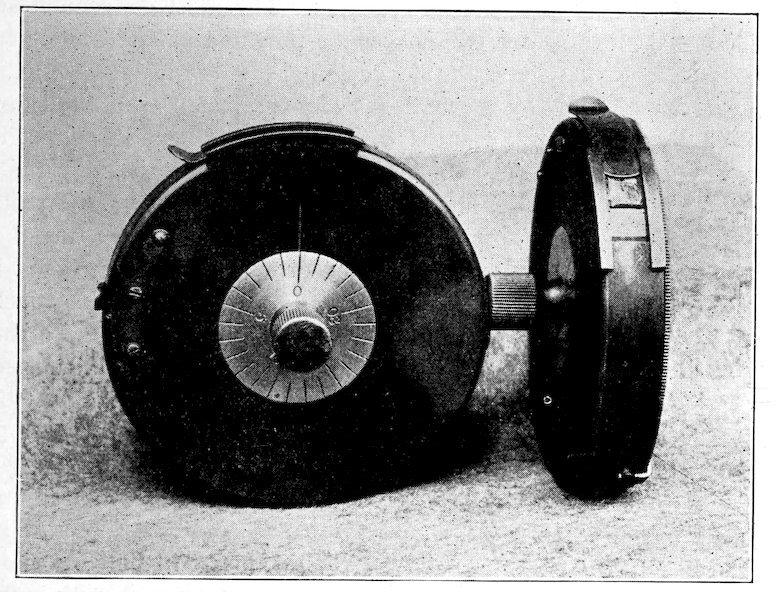 77. Construction. The simple form of photometer shown in the illustration is a light-tight metal box with a central wheel upon which a strip of photographic paper is fastened. This wheel is revolved by the thumbscrew past an opening 6 mm. square which is closed by means of a slide working closely between two flanges. At the edge of the opening, and beneath the slide is a hollow for the reception of a permanent light standard. The disk of the thumbscrew is graduated into twenty-five parts, and these are numbered. A line just beneath the opening coincides with the successive lines on the disk, and indicates the number of the exposure. The wheel contains twenty-five hollows in which the click works, thus moving each exposure just beyond the opening. The metal case is made in two parts, so that the bottom may be readily removed, and the photographic strip placed in position. The water-photometer is similar except that the opening is always covered with a transparent strip and the whole instrument is watertight. These instruments have been made especially for measuring light by the C. H. Stoelting Co., 31 W. Randolphstreet,Chicago,Ill.Thepriceis$5.