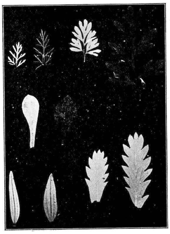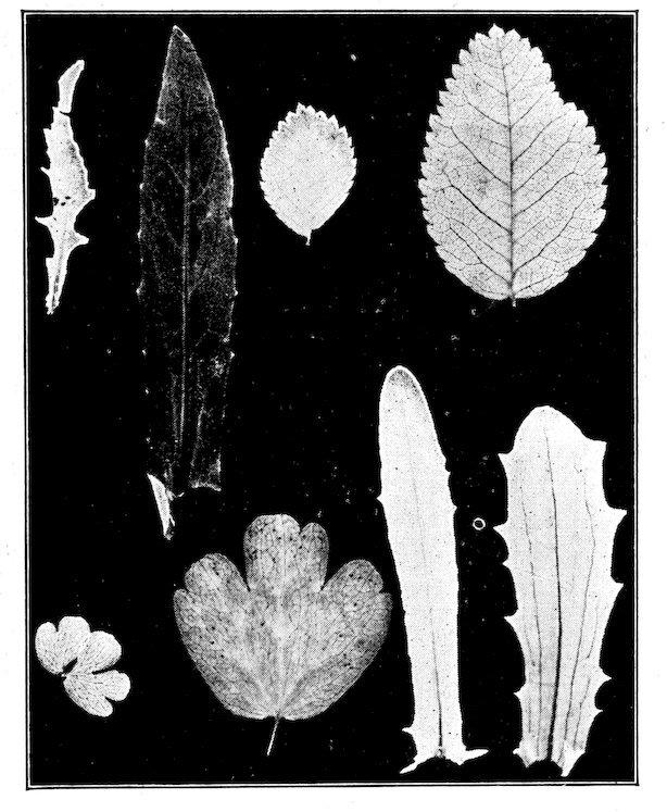 90. Leaf and epidermis prints. In diphotic leaves the screening effect of the lower epidermis may be ignored. Isophotic sun leaves, i. e., those nearly upright in position or found above lightcolored, reflecting soils, are usually strongly illuminated on both sides, and the absorbed light can be obtained only by measuring the screening effect of both epiderms. Shade leaves and submerged leaves often contain chloroplasts in the epidermis, and the above method can not be applied to them. In fact, in habitats where the light is quite diffuse, practically all incident light is absorbed. The rare exceptions are those shade leaves with a distinct bloom. In addition to their use in obtaining the amount of light absorbed, both leaf and epidermis prints are extremely interesting for the direct comparison of light relations in the leaves of species belonging to different habitats. The relative screening value of the upper and lower epidermis, or of the corresponding epiderms of two ecads or two species, is readily ascertained by exposing the two side by side in sunshine, over the slit in the photometer. For leaf prints fresh leaves are desirable, though nearly the same results can be obtained from leaves dried under pressure. The leaves are grouped as desired on the glass of a printing frame, and covered with a sheet of solio. They are then exposed to full sunlight, preferably at meridian, and the prints evaluated by means of the multiple standard. This method is especially useful in the comparison of ecads of one species. These differences due to transmitted light are very graphic, and can easily be preserved by “toning”theprintintheusualway.