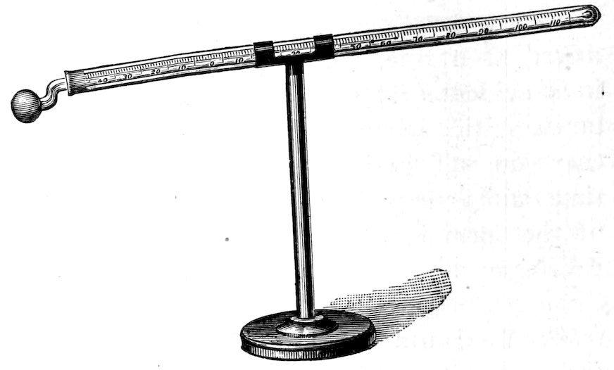 97. Radiation thermometers. These are used to determine the radiation in the air, and from the soil, i. e., for solar and terrestrial radiation. The latter alone has been employed in the study of habitats, chiefly for the purpose of ascertaining the difference in the cooling of different soils at night. The terrestrial radiation thermometer is merely a special form of minimum thermometer, so arranged in a support that the bulb can be placed directly above the soil or plant to be studied. It is otherwise operated exactly like the minimum thermometer, and the reading gives the minimum temperature which the air above the plant or soil reaches, not the amount of radiation. As a consequence, these instruments are valuable only where read in connection with a pair of maximum-minimum thermometers in the air, or when read in a series of instruments placed above different soils or plants.