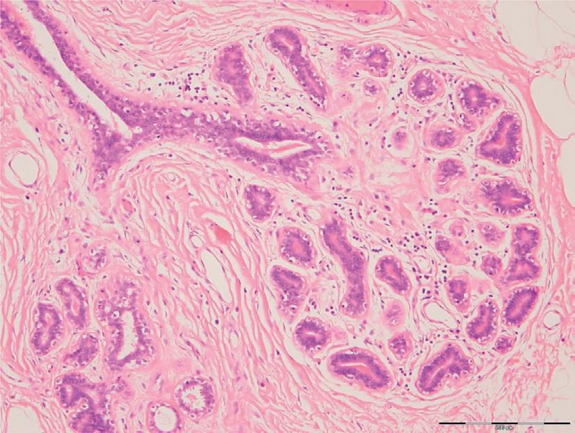 Figure 1.5 • Micrograph of haematoxylin and eosin stained section of breast tissue showing terminal duct lobular unit leading to duct. Note surrounding connective tissue and adjacent fat. Courtesy of Dr Jeremy Thomas.