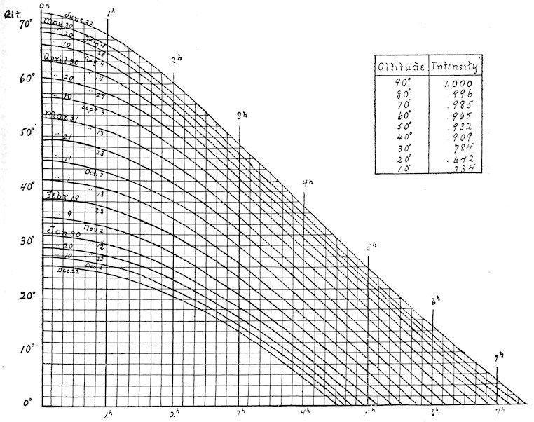 The changes in the amount of light due to the altitude of the sun are produced by the earth’s atmosphere. The absorption of light rays is greatest near the horizon, where their pathway through the atmosphere is longest, and it is least at the zenith. The absorption, and, consequently, the relative intensity of sunlight, can be determined at a given place for each hour of any sunshiny day by the use of chart 13. This chart has been constructed for Lincoln, and will serve for all places within a few degrees of the 40th parallel. The curves which show the altitude of the sun at the various times of the day and the year have been constructed by measurements upon the celestial globe. Each interval between the horizontal lines represents 2 degrees of the sun’s altitude. The vertical lines indicate time before or after the apparent noon, the intervals corresponding to 10 minutes. If the relative intensity at Lincoln on March 12 at 3:00 P.M. is desired, the apparent noon for this day must first be determined. A glance at the table shows that the sun crosses the meridian on this day at 9 minutes 53 seconds past noon at the 90th meridian. The apparent noon at Lincoln is found by adding 26 minutes 49 seconds, the difference in time between Lincoln and a point on the 90th meridian. When the sun is fast, the proper number of minutes is taken from 26 minutes 49 seconds. The apparent noon on March 12 is thus found to fall at 12:37 P.M., and 3:00 P.M. is 2 hours and 23 minutes later. The sun’s altitude is accordingly 36°. If the intensity of the light which reaches the earth’s surface when the sun is at zenith is taken as 1, the table of thesun’saltitudesgivestheintensityat3:00 P.M. onMarch12as.85.