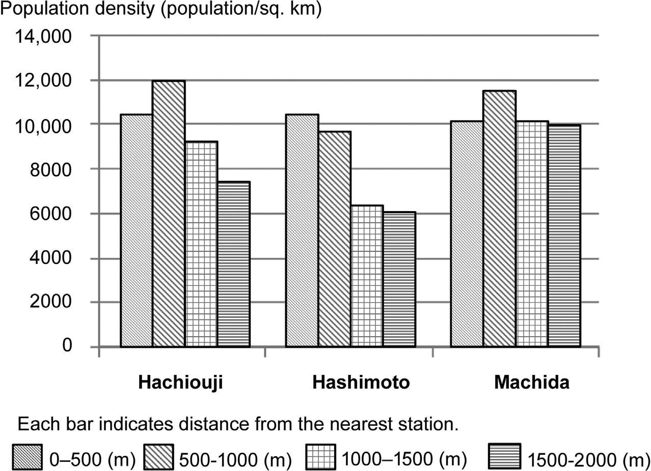 changeinthepopulationdensityinthreesuburbtownsaccordingtothedistancefromtheneareststationin2005(SagamiharaCity,2011).Thesethree townsarenewtowns,informallycalled“bedtowns,”whichwerebuiltas residentialplacesforemployeesworkinginthecenterofTokyo.Comparing thedensitypatternsamongthethreetowns,whilethepopulationdensity decreaseswithdistanceinHachioujiandHashimoto,thedensityisalmost constantinMachida.TheconstantdensityofMachidageneratesgreater congestionofcommutingtripsthanintheothertwotowns.Thisdifference inpopulationdensitypatternsisprobablycausedbypastlanduseplanning.