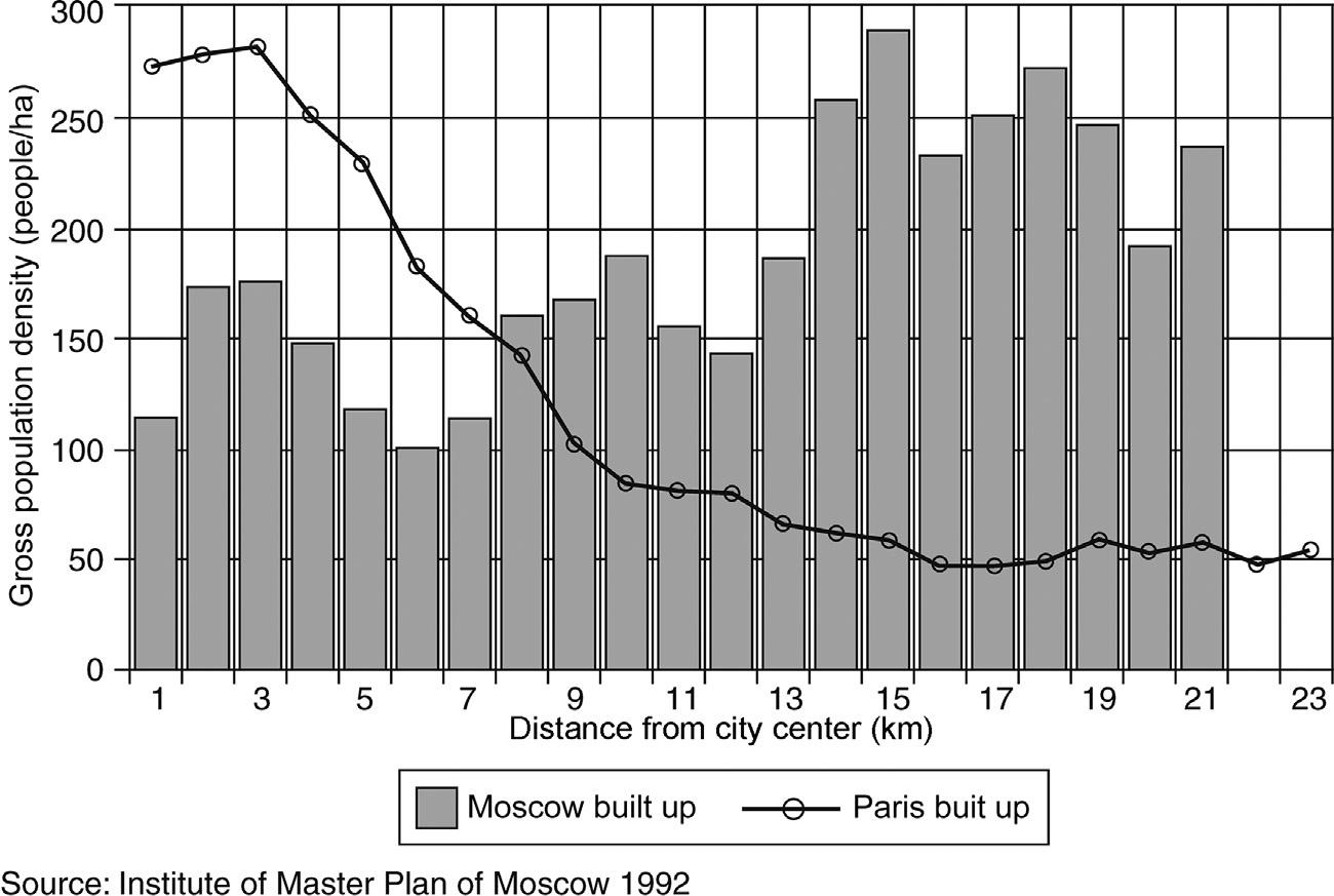 Fig.1.1 ComparisonofdensitygradientsofMoscowandParis. (Source:Bertaud,A., Renaud,B.,1997.Socialistcitieswithoutlandmarkets.J.UrbanEcon.41(1),137–151.)