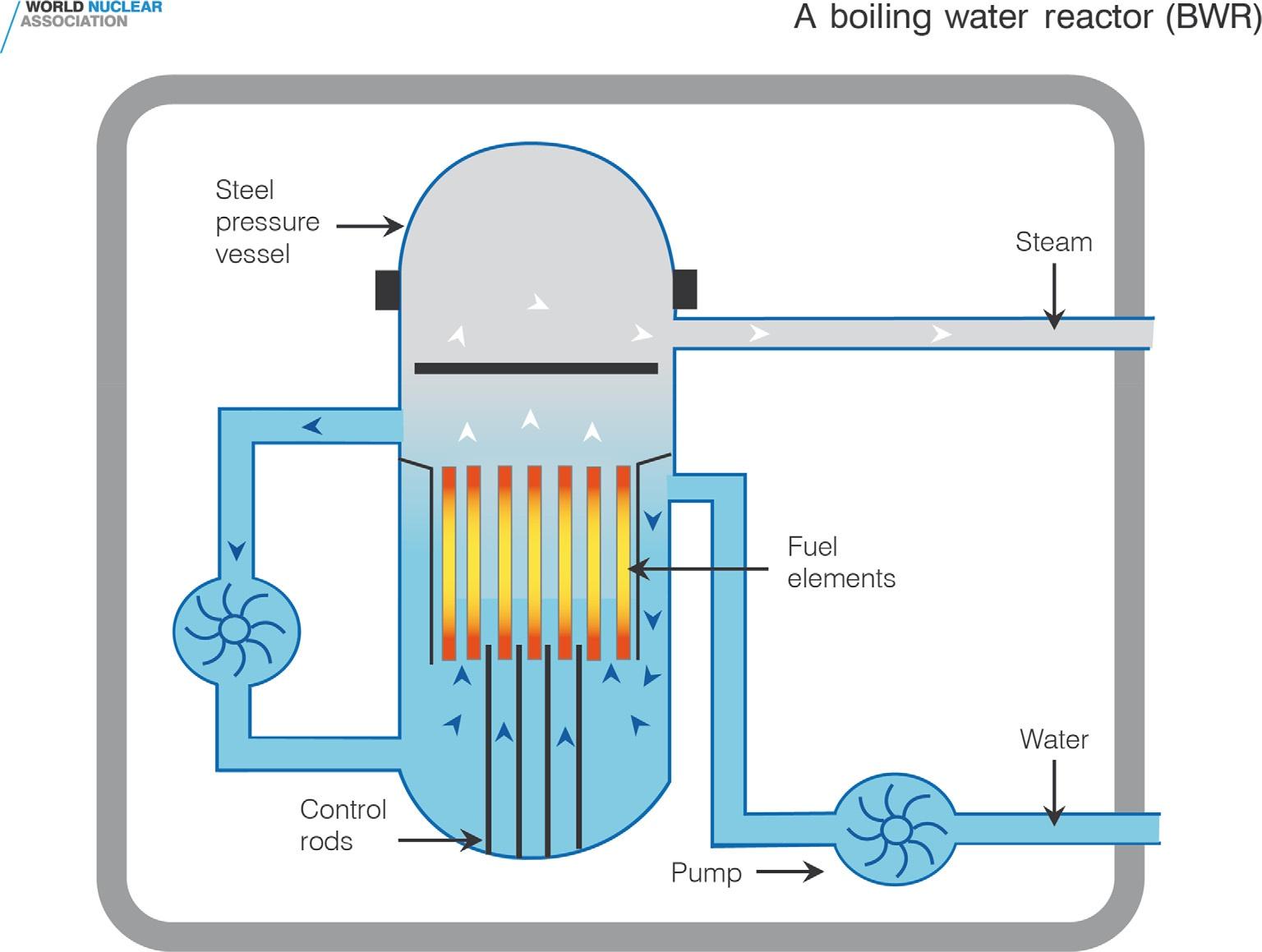asthecoolantandneutronmoderator.Eachreactorrequiresnuclearfuelandallwaterreactorsutilizeuraniumin oxideforminazirconium-alloycladding.BWRsandPWRsutilizeenricheduraniumfuels(typically3–5% 235U), whereasPHWRsaredesignedtoutilizenaturaluranium(only 0.7% 235U).Eachalsorequirescontrolrods,which aremadewithneutron-absorbingmaterialsuchascadmium,hafnium,orboron,andareinsertedorwithdrawnfrom thecoretocontrolthefissionreaction,ortohaltit.Apressurevesselisarobuststeelvesselcontainingthereactor coreandmoderator/coolant.Inaddition,bothPWRsandPHWRshavesteamgenerators,wherethehigh-pressure primarycoolantbringingheatfromthereactorisusedtomakesteamfortheturbineinasecondarycircuit.Finally, thecontainmentisthestructurearoundthereactorandassociatedsteamgenerators,whichisdesignedtoprotectit fromoutsideintrusionandtoprotectthoseoutsidefromtheeffectsofradiationincaseofanyseriousmalfunction inside.Itistypicallyameter-thickconcreteandsteelstructure.