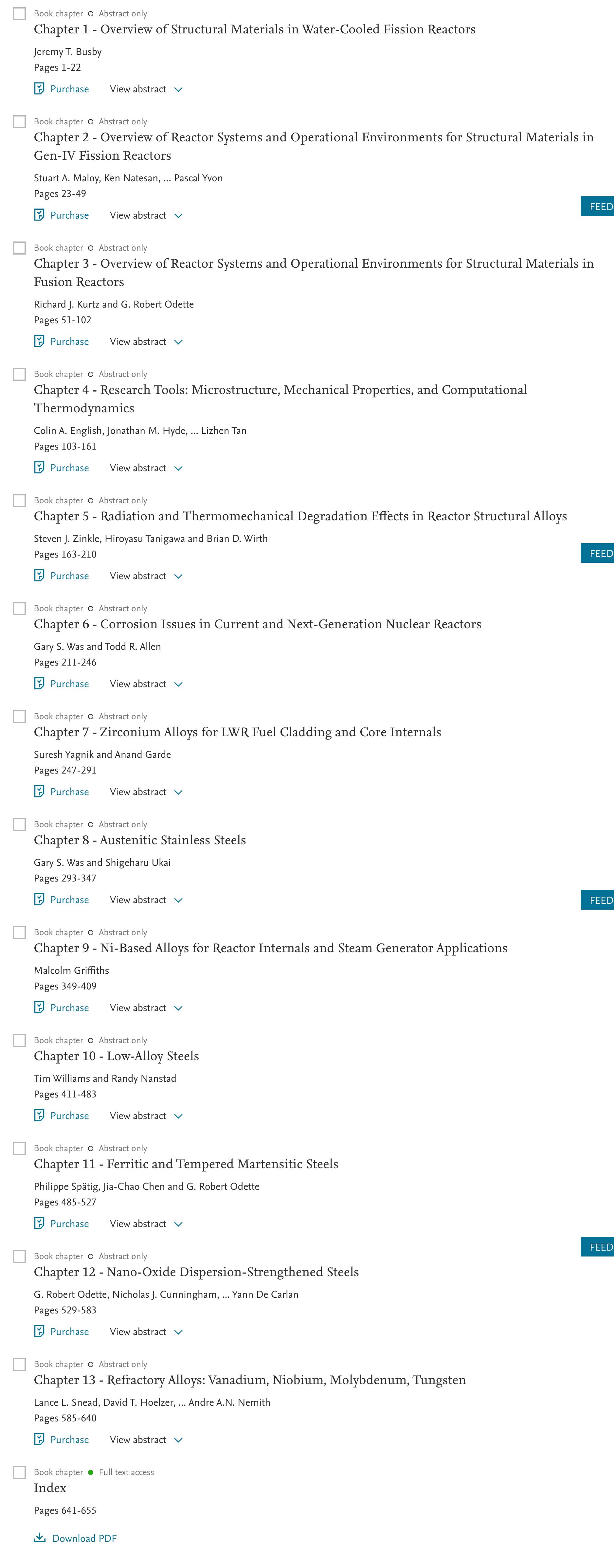 Thefinalsevenchapterscontaindetailedassessmentsoftheleadingstructuralalloysystemsfornuclear fissionandfusionreactors,includingunirradiatedandirradiatedmechanicalpropertiesandsummariesof alloy-specificradiation-induceddegradationissues. Chapter7 bySureshYagnikandAnandGardesummarizesthefabricationandenvironmentaldegradationprocessesforZralloysinwater-cooledreactors,includingcorrosionundernormalandtransientconditions,hydrideformation,irradiationeffects,andkeyin-service failuremechanisms. Chapter8 byGaryS.WasandShigeharuUkaisummarizesradiation-inducedmicrostructuralandpropertychangesinausteniticstainlesssteels(predominantly300seriesstainlesssteels),includingradiation-inducedsegregation,precipitation,compatibilitywithnuclearfuelandvariouscoolants, andstresscorrosioncrackingissues. Chapter9 byMalcolmGriffithsreviewsthemetallurgyandproperties ofcommercialnickelalloys,includingdeformationandfracturemechanisms,stresscorrosioncracking, chemicalcompatibility,andradiationeffects,withparticularemphasisontheroleofthelargeamountof transmutantHegeneratedduringirradiationinreactorswithhighthermalneutronfluxes. Chapter10 by TimWilliamsandRandyNanstadreviewsthefabricationmethods,properties,andin-servicedegradation (inparticularfracturetoughness)oflowalloysteelsusedforreactorpressurevessels. Chapter11 byPhilippe Spatig,Jia-ChaoChen,andG.RobertOdettesummarizesthedevelopmentoftemperedferritic/martensitic steelsfornuclearenergyapplications,includingcoolantcorrosionandembrittlement,unirradiatedandirradiatedmechanicalproperties,andheliumeffectsonmechanicalpropertiesandcavityswelling. Chapter12 by G.RobertOdette,NicholasJ.Cunningham,TiberiuStan,M.ErshadulAlam,andYannDeCarlanreviewsthe processingmethodsandpropertiesofoxidedispersionstrengthenedferritic/martensiticsteelscontaininghigh densitiesofnanoscalesecondphasesthatexhibitimpressiveimprovementsinstrength,high-temperaturestability,andradiationresistancecomparedtotraditionalferritic/martensiticsteels. Chapter13 byLanceL.Snead, DavidT.Hoelzer,MichaelRieth,andAndreA.N.Nemithsummarizesthefabricationprocedures,typicalphysicalandmechanicalproperties,andreportedradiationeffectsforfourimportantrefractoryalloysystemsbased onvanadium,niobium,molybdenum,andtungsten.Variouschaptersdealwithsimilarissues,oftenfromdifferentperspectives,thuscross-referencesbetweenchaptersareprovidedinanumberofcases.