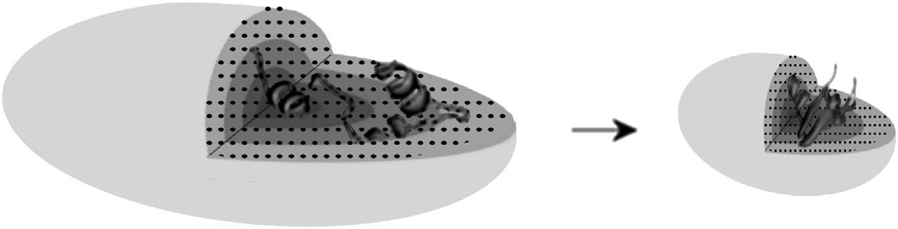 Thisdiagramdemonstratesthecoreconceptofthefuzzyoildrop(FOD)model, whichpositstheexistenceofanexternalforce fieldgeneratedbytheaqueoussolvent. Theexternal fieldguideshydrophobicresiduestowardthecenteroftheproteinbody, whilehydrophilicresiduesareinsteadexposedonitssurface.Theprocesscontinuesas theencapsulatingellipsoidcapsuleshrinks(viachangesin s coefficientsofthe3D Gaussian).Thegradualincreaseofgraycolorvisualizetheincreaseofhydrophobicity concentration.