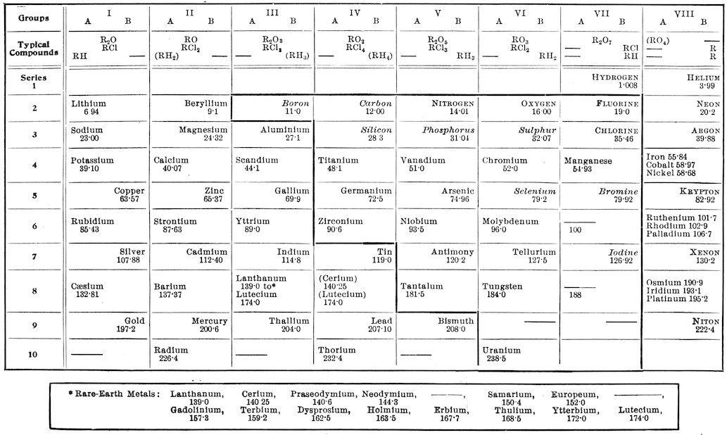 In order that this subject may be explained to some extent Mendeléeff’s table is given here, with the addition of the recently discovered elements and some other modifications.