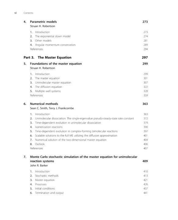 Thestep-sizedistribution, P(E,E0 ),containsalloftheinformationaboutenergytransfer. Althoughseveralsimpletheorieshavebeenproposed,thereisnocompletetheoryfor describing P(E,E0 )and,hence, P(E,E0 )hasbeendescribedbyempiricalmodelsthat aredefinedintermsofdeactivatingcollisions(i.e.,for E0 > E);foractivatingcollisions, thedistributionisfoundbyapplicationofdetailedbalanceEq. (1.2).The strong collision model hasbeenveryimportantinthedevelopmentofunimolecularreactionratetheory [18–20].Itconsistsofassumingthateverycollisionresultsintheestablishmentofa Boltzmann vibrationaldistribution: