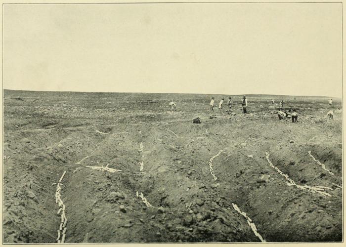 In the case of rail transportation, paths one hundred and fifty feet apart are cut through the fields so that temporary railroad tracks may be laid and cars run in and loaded on these tracks. The whole