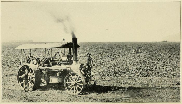 In cultivating, the ground is turned with steam ploughs to depths up to twenty-four inches. These ploughs are operated by powerful engines that work in pairs, one on each side of a field, usually from one thousand to fifteen hundred feet apart. One engine pulls a gang-plough across the field and the other draws it back. By this method the rich soil is thoroughly loosened and a wonderful vegetable growth results. Ordinarily in California the farmer ploughs only from four to six inches deep.
