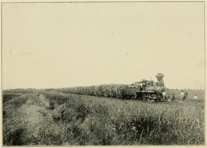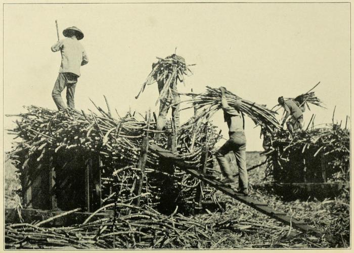 The loaders follow up the cutters. These men lay a strap on the ground and pile the stalks on the strap until they have a bundle of cane weighing from seventy-five to one hundred pounds. With a dexterity born of long practice, they sling a bundle upon their shoulders and carry it up an inclined runway to a railroad car not over seventy-five feet away and dump it on the car. The cutting and loading are usually done by contract, at so much per ton, and it is remarkable how proficient the men become.