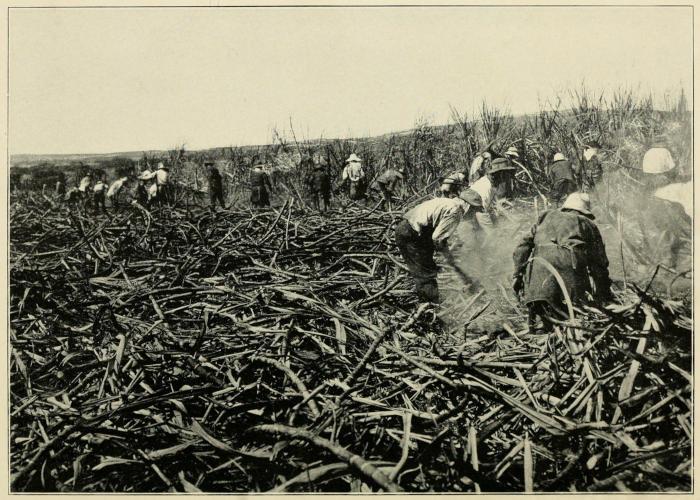 The harvesting then begins and continues until the end of July or August. Usually the field is set on fire before cutting. On account of the great amount of moisture or juice in the cane, the stalks do not burn, but the leaves are thoroughly consumed. This operation eliminates a good deal of leaf material that is not only useless, but which, if sent to the mill, would increase the cost of crushing, besides absorbing a certain quantity of the juice expressed from the cane.