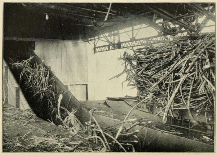 The fibrous, woody part of the cane, or bagasse as it is called, is comparatively dry as it leaves the last rolls. It is conveyed from the mills to the boiler house on a wide slat conveyor, and fed directly into the furnaces under the boilers that generate the steam for power and boiling purposes. A modern raw-sugar mill requires practically no other fuel than that obtained as a by-product from the crushing of the cane.