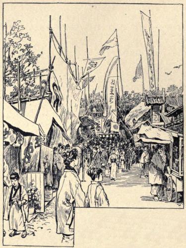 The festival of the kiku, or chrysanthemum, in autumn, decks the whole empire with red, white, and yellow flowers. The sixteenpetalled chrysanthemum is the imperial or government crest; and the Emperor’s birthday, the third of November, coming in the height of the season, is made a gala-day in every province, and the occasion of gorgeous flower shows. The Western mind is filled with envy to discover that the wide-spreading, spicy flowers selling here for a few coppers each, cost as many dollars under new names across the water. Dango-zaka, dismissed with a line in the guidebook, is more picturesquely Japanese in autumn than any other suburb of Tokio. A community of florists tend, prune, dwarf, and cultivate their chrysanthemum plants in obscurity until the blossoming time makes Dango-zaka a gay fair. The unique productions of their gardens are set pieces of flowers on a gigantic scale. Under matted sheds, which are so many temporary stages without footlights, groups with life-sized figures are arranged, whose faces and hands are of wax or composition, but whose clothes, the accessories, and scenery are made of living flowers, trained so closely over a framework that the mechanism is not even suspected. The plants forming the flower-pieces are taken up with all their roots, wrapped in straw and cloths, propped up inside the skeleton framework, and watered every day. The flowers, drawn to the outside and woven into place, produce a solid surface of color, and are shaded with the most natural effects. The tableaux represent scenes from history and legend, and from the latest plays, or even illustrate the last emotional crime of the day. Here are seen whole mountain-sides of flowers, with water-falls of white blossoms spreading into floral streams; and chrysanthemum women leading chrysanthemum horses, ridden by chrysanthemum men across chrysanthemum bridges. Gigantic flowers, microscopic flowers, plants of a single blossom, and single plants of two hundred blossoms, have bamboo tents to themselves. Touters invite one to enter, proprietors chant the story of their pictures, and the sideshow, the juggler, the fakir, and the peddler make the bannered and